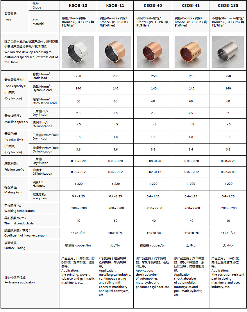 結構特性 KSOB 金屬復合自潤滑材料以優質低碳鋼為基板,中間燒結球形多孔銅粉層,表面扎制以PTFE 為主的耐磨潤滑材料作為軸承工作層,這種材料具有優異的機械承載能力,中間銅粉層不但可以及時傳遞軸承運行過程中產生的熱量,同時也提高了塑料層與基板的結合強度。PTFE 設計適用于完全干摩擦狀態,并根據潤滑情況、摩擦系數和耐久性要求開發了多種材料。KSOB 的PTFE 金屬復合材料在外部潤滑或者不潤滑的情況下,都能在最廣泛的載荷、速度以及溫度范圍內提供最好的表現。 產品應用 農業機械:拖拉機、聯合收割機、農作物噴霧器、推土機、平地機等; 汽車行業:動力轉向泵、轉向器推力墊片、盤式制動器、減震器、門鉸鏈、雨刮器、椅子調角器、空氣閥以及電磁閥等; 辦公商務機械:復印機、傳真機、打印機、郵件處理機等; 液壓元件和閥門:齒輪泵、柱塞泵、葉片泵,球閥、蝶閥,氣缸、油缸以及其他液壓元件等; 家用電器:冰箱、空調、吸塵器、縫紉機、清洗機、微波爐和健身器材等; 以及其它物流機械、包裝機械、紡織機械、港口機械、礦產機械和森林機械等等。 實際運用中根據使用環境、工況和環保要求的不同,低碳鋼板可以改為銅板或不銹鋼板,內表面塑料層可以選擇PTFE 含鉛或者不含鉛材料以及其他高分子填充物,外表可以鍍錫或者鍍銅。產品范圍包括:KSOB-10、KSOB-11、KSOB-40、KSOB-41、KSOB-1SS。