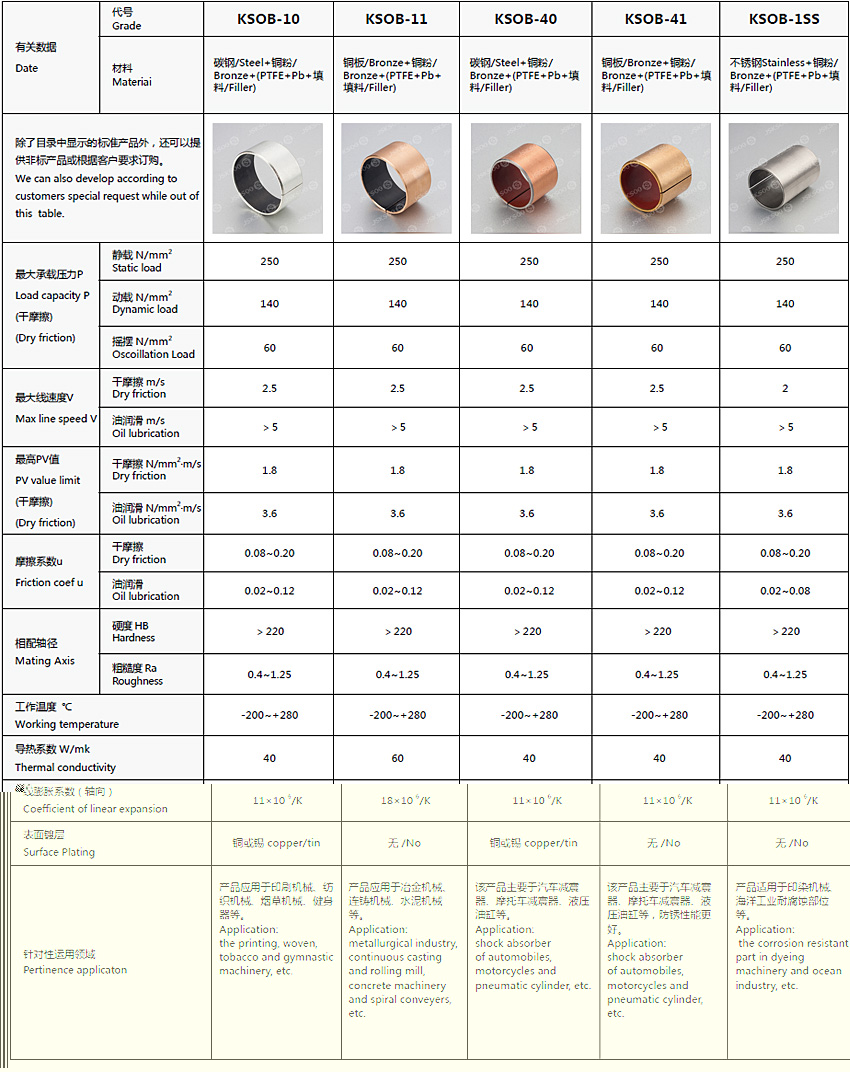 實(shí)際運(yùn)用中根據(jù)使用環(huán)境、工況和環(huán)保要求的不同,低碳鋼板可以改為銅板或不銹鋼板,內(nèi)表面塑料層可以選擇PTFE 含鉛或者不含鉛材料以及其他高分子填充物,外表可以鍍錫或者鍍銅。產(chǎn)品范圍包括:KSOB-10、KSOB-11、KSOB-40、KSOB-41、KSOB-1SS。