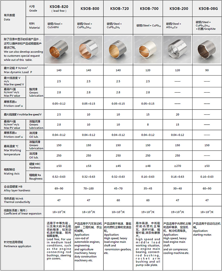 雙金屬復(fù)合軸承以優(yōu)質(zhì)低碳鋼為基體,表面燒結(jié)具有低摩擦特性的銅合金(CuPb10Sn10、CuPb6Sn6Zn3、CuPb24Sn4、CuPb30、AlSn20Cu、CuSn8Ni)作為軸承的耐磨層,銅合金表面可以根據(jù)使用工況需要加工出各種類型的油槽、油孔、油穴等,以適合于無法持續(xù)加油或者難以加油的場合。材料通過二次燒結(jié)二次擠壓可以得到很好的接合強(qiáng)度和最佳的承載能力。
